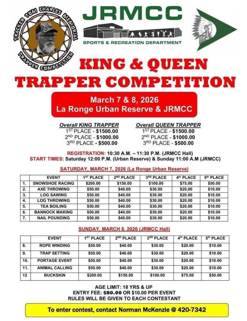 On behalf of JRMCC Sports & Recreation Department, I would thank all the participants, volunteers and supporters of our signature event of the 2026 Lac La Ronge Winter Festival, the King and Queen Trapper Competition. A special thank you once again to our amazing event coordinator, Tania Colbert, for putting it all together.